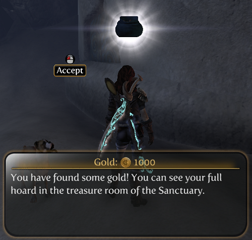 --If only I knew how to get the stupid "accept" dialogue to go away now! I mean, there's only one option - "accept". Why do I need to be given a choice if there's no choice? Just show me my loot for 2 seconds while you let me walk around, then have it disappear into my inventory![/rant]